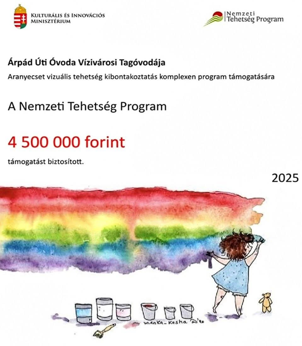 Nagy öröm számunkra, hogy a Kulturális és Innovációs Minisztérium a Nemzeti Tehetség Program keretében idén 4.500.000 Ft pályázati támogatással ismeri el törekvéseinket. Ennek köszönhetően változatos, minőségi eszközöket és programokat tudunk biztosítani, amelyek valóban teret adnak a tehetség szárnyalásának.